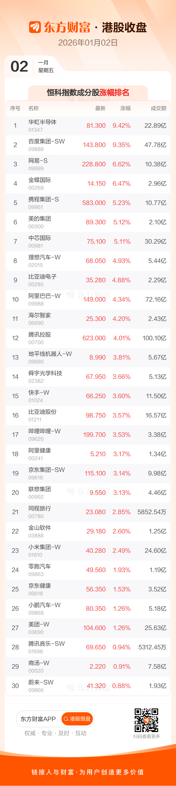 1月2日港股收盘:恒指涨2.76% 恒生科技指数涨4%