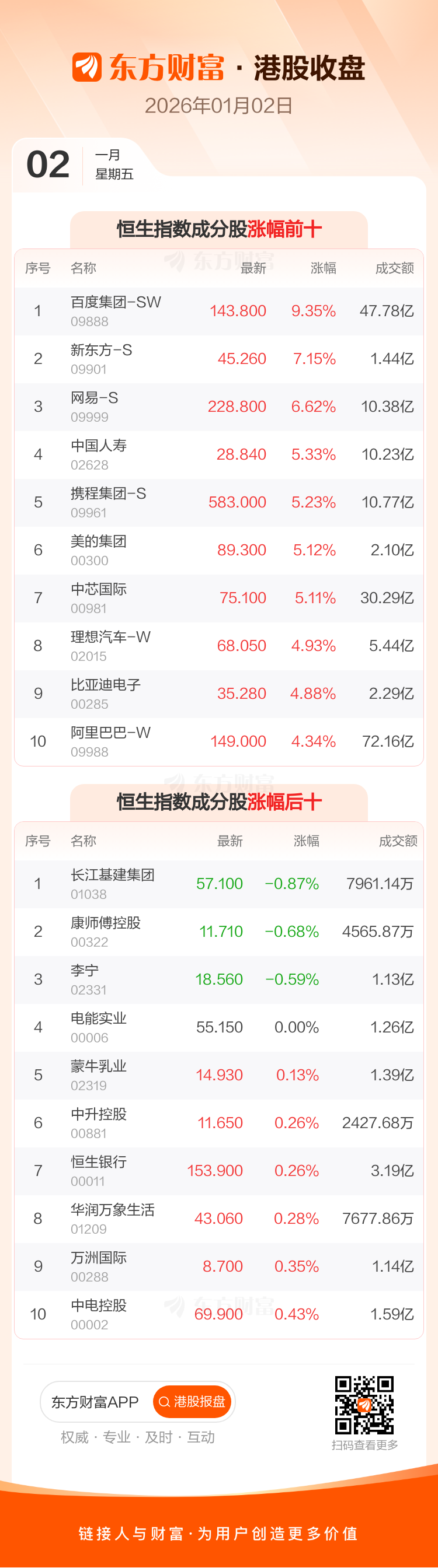 港股1月2日收盘走高,恒生指数收报26338.47点,涨707.93点,涨幅2.76%;恒生科技指数收报5736.44点,涨220.46点,涨幅4.0%。恒生指数成分股中百度集团-SW、新东方-S、网易-S涨幅居前,长江基建集团、康师傅控股、李宁跌幅靠前。恒生科技指数成分股中华虹半导体、百度集团-SW、网易-S涨幅居前。