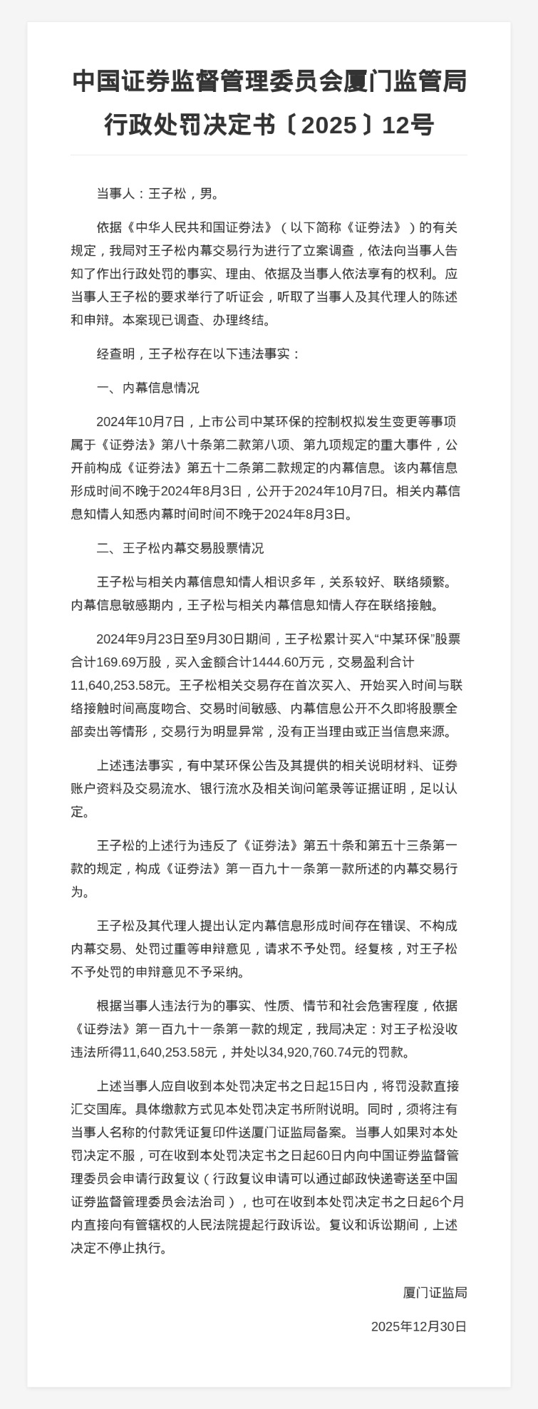 王子松因内幕交易被罚3492万,并没收违法所得1164万