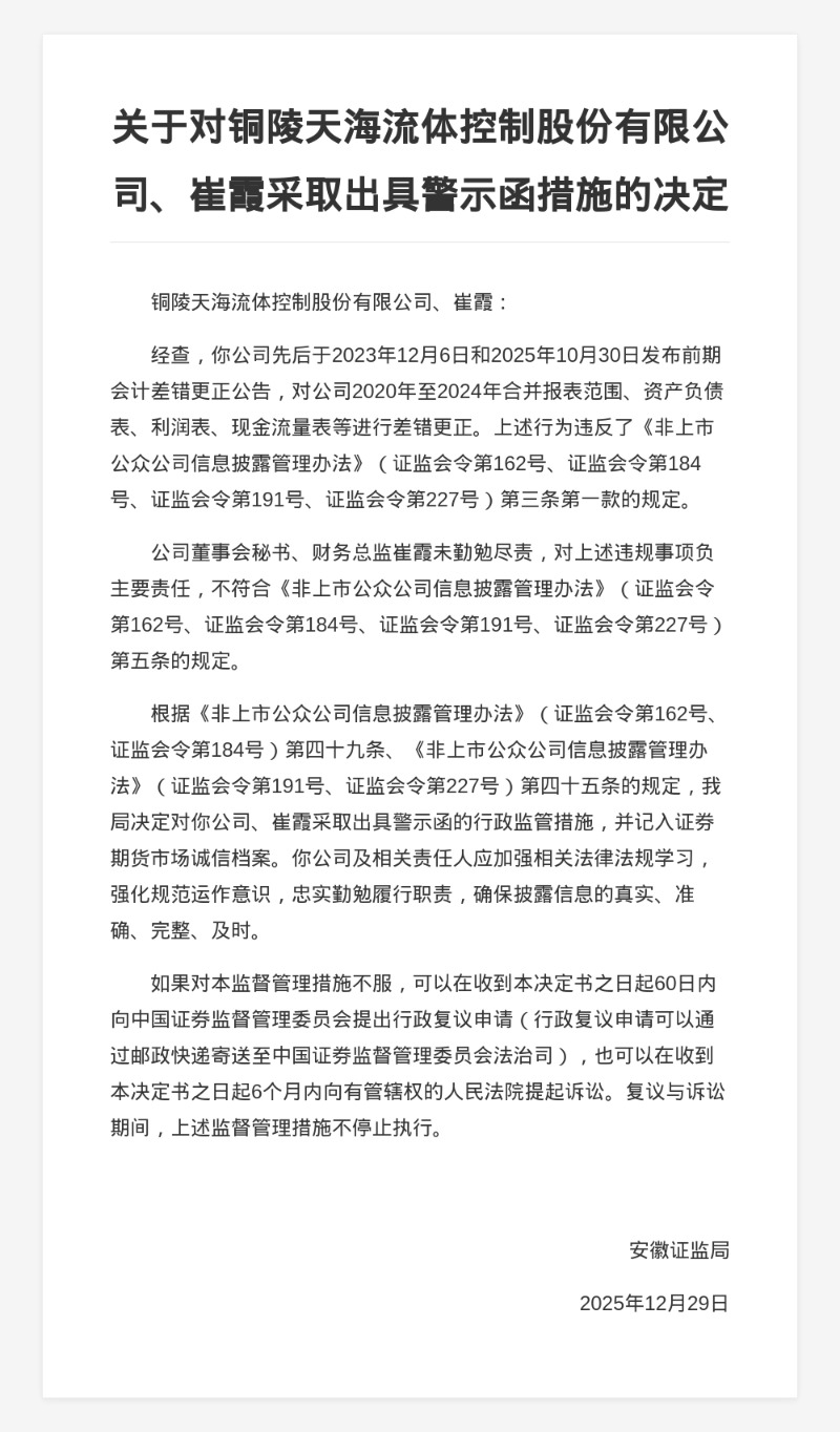 决定书指出,铜陵天海流体控制股份有限公司先后于2023年12月6日和2025年10月30日发布前期会计差错更正公告,对公司2020年至2024年合并报表范围、资产负债表、利润表、现金流量表等进行差错更正。