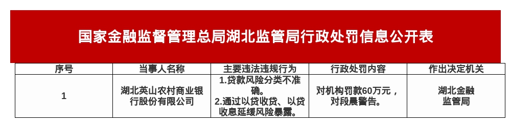 湖北英山农商行被罚60万,涉贷款风险分类不准确等