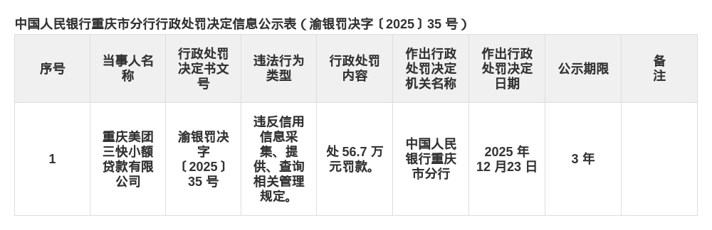 重庆美团三快小贷被罚56.7万,涉信用信息采集等违规