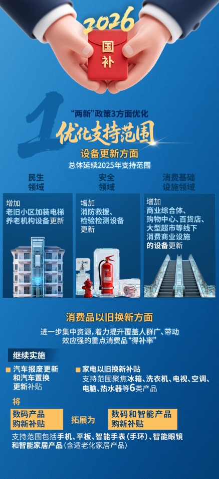 国家发展改革委、财政部印发的《关于2026年实施大规模设备更新和消费品以旧换新政策的通知》明确2026年“两新”政策的支持范围、补贴标准和工作要求。