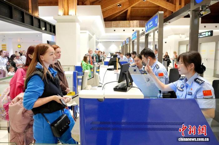 2026年1月1日凌晨,来自俄罗斯符拉迪沃斯托克的SU856次航班搭载155名旅客平稳降落三亚凤凰国际机场。图为游客正在办理入境手续。王程龙摄