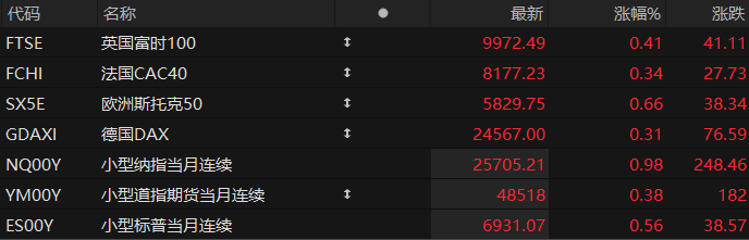 2026年首个交易日,美股三大股指期货齐涨,欧洲主要指数普遍上涨。截至发稿,纳斯达克100指数期货涨0.98%,道指期货涨0.38%,标普500指数期货涨0.56%。