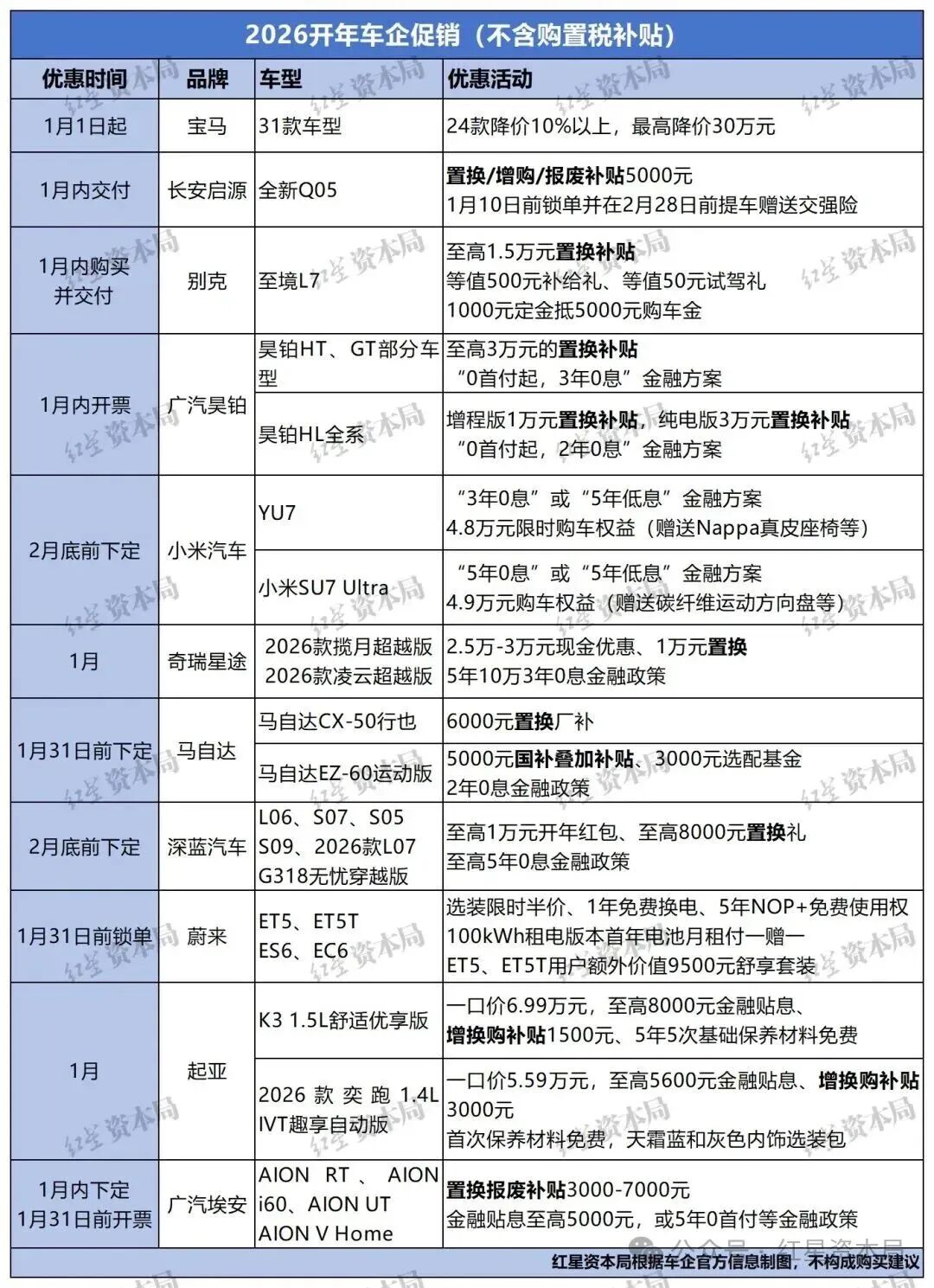 另据红星资本局统计,2026年开年至今已有16个汽车品牌发布了1月限时促销政策,涉及近70款车型。
