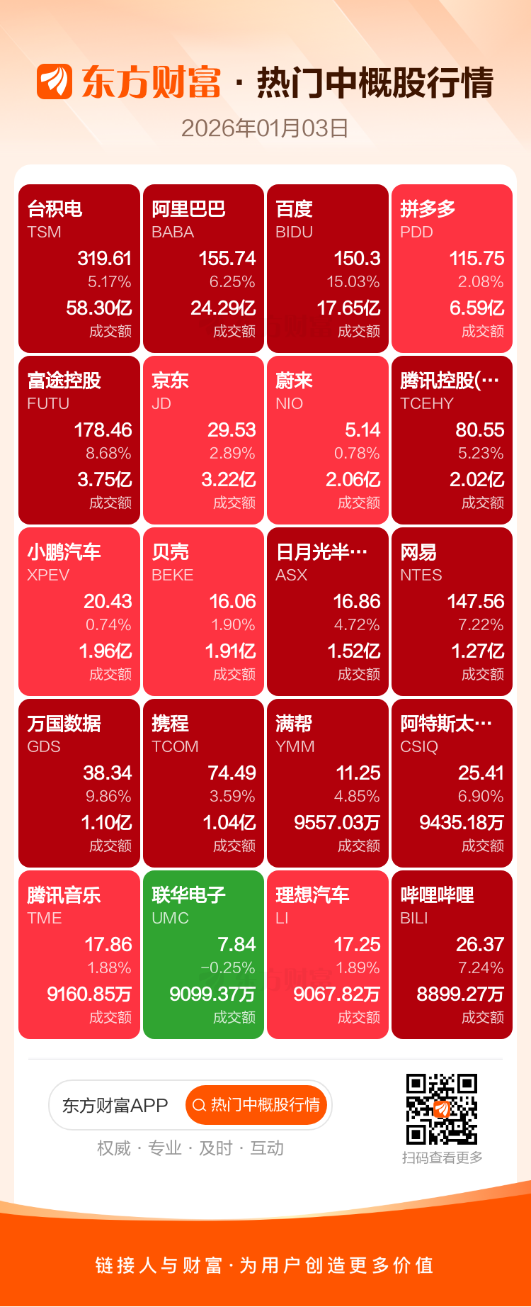 台积电涨5.17%,阿里巴巴涨6.25%,百度涨15.03%,拼多多涨2.08%,富途控股涨8.68%,京东涨2.89%,蔚来涨0.78%,腾讯控股(ADR)涨5.23%,小鹏汽车涨0.74%,贝壳涨1.90%。
