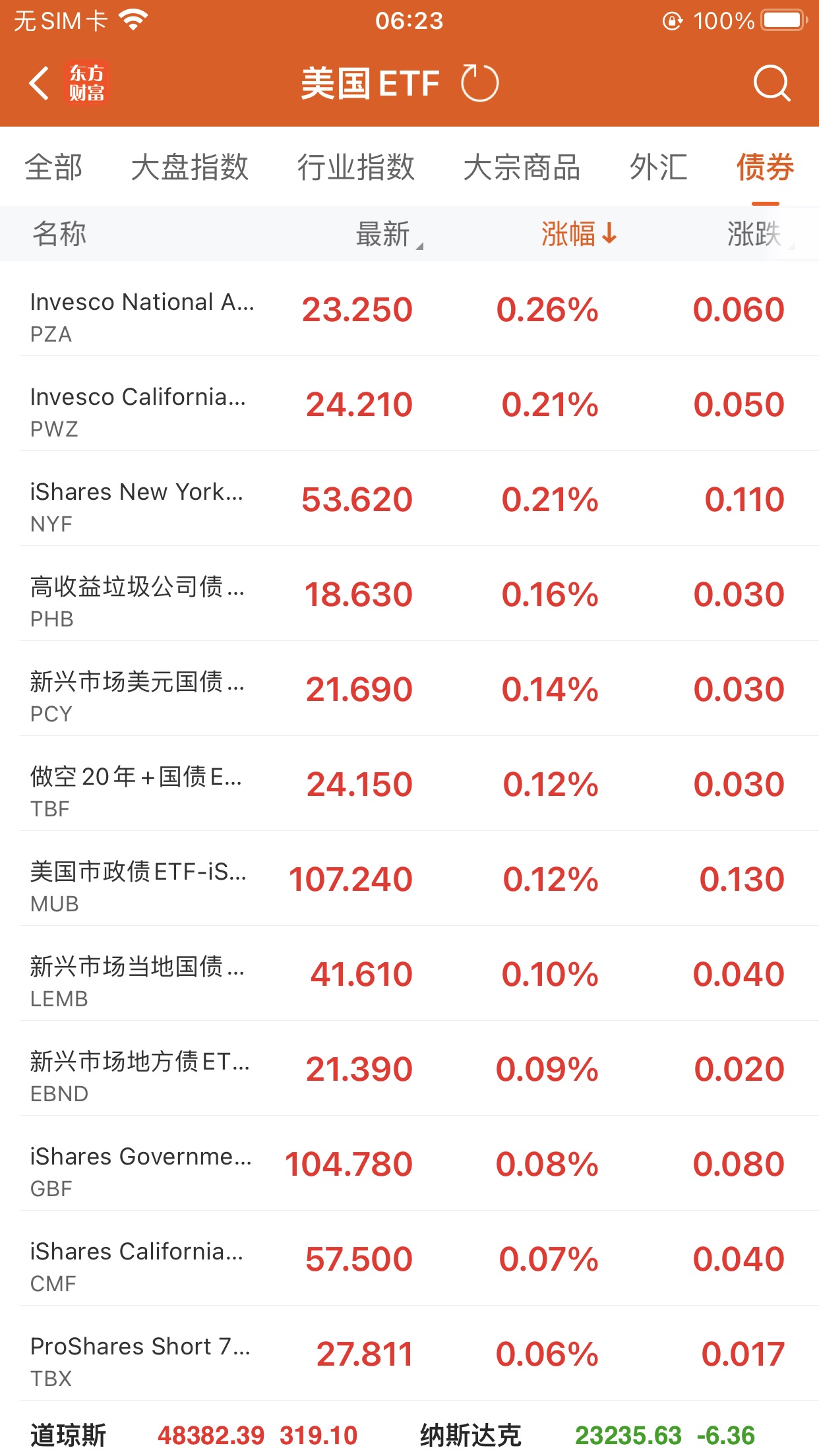 PowerShares全国免AMT地方债投资(PZA.US) 升0.26%,成交额2158.53万美元。