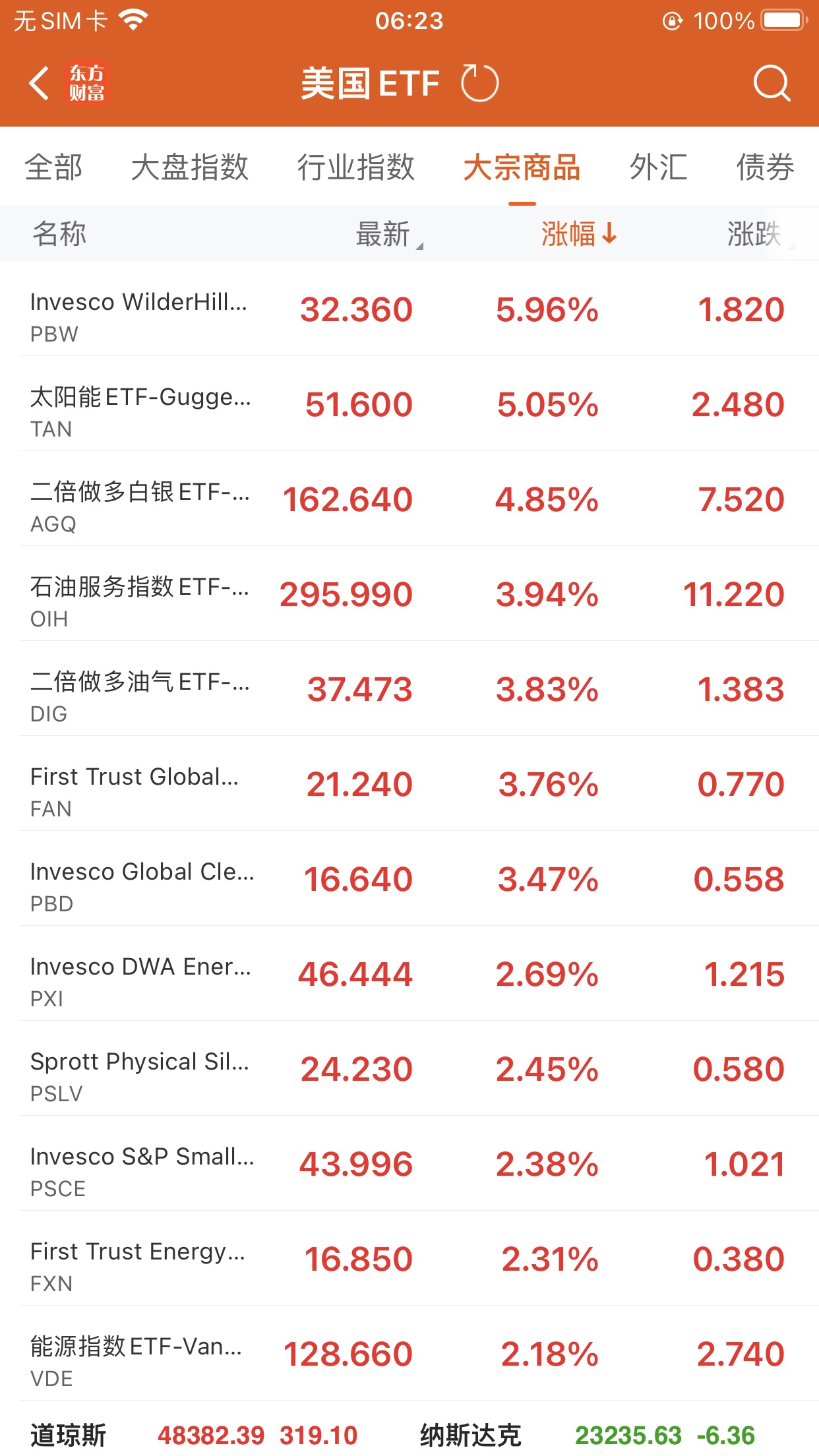 WilderHill清洁能源ETF-Invesco(PBW.US) 升5.96%,成交额2434.32万美元。