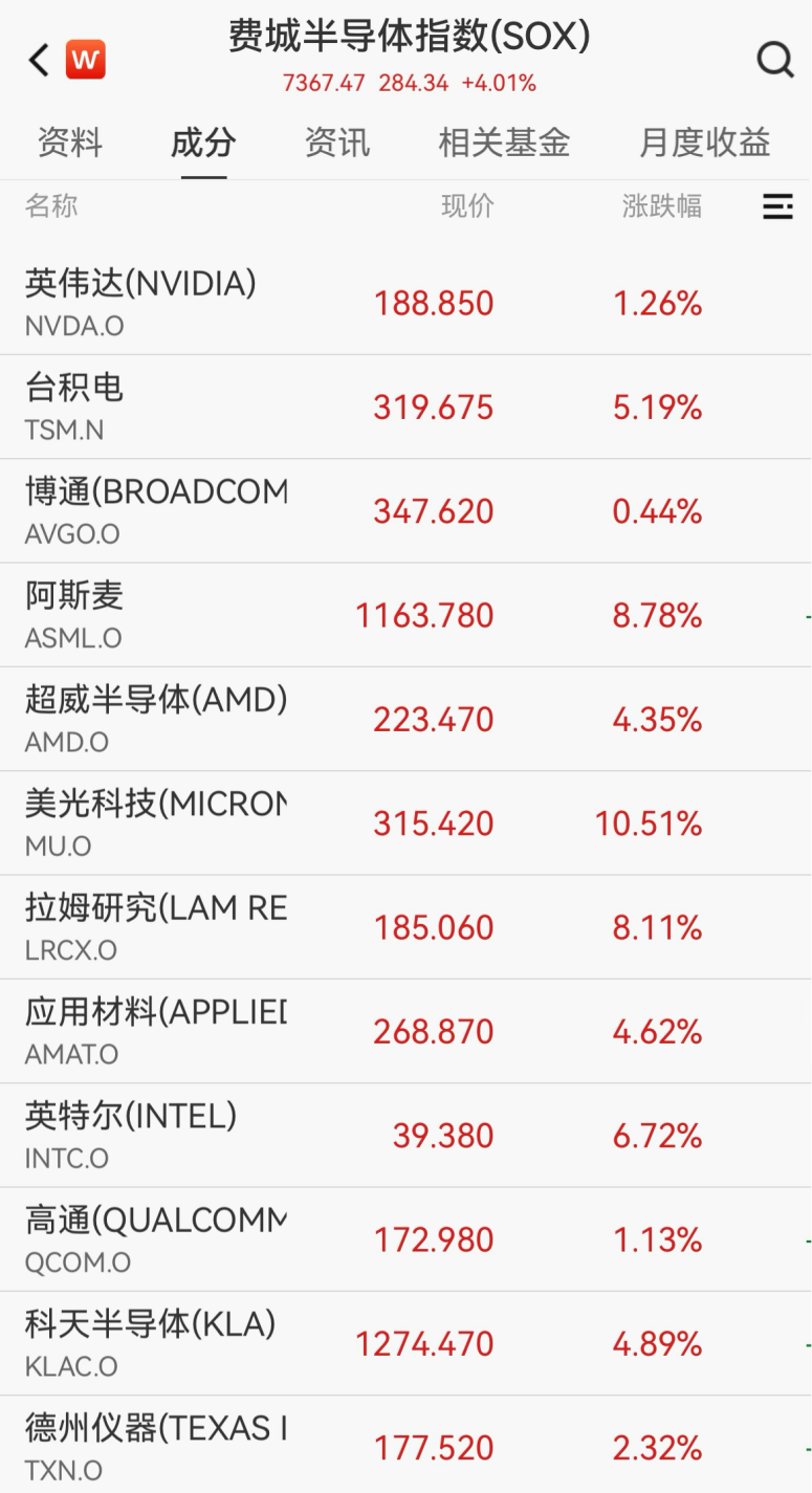 个股方面,美光科技涨超10%,英伟达涨1.26%,台积电大涨5.19%,英特尔涨6.72%,AMD大涨4.35%,阿斯麦、艾马克科技、拉姆研究均涨超8%。