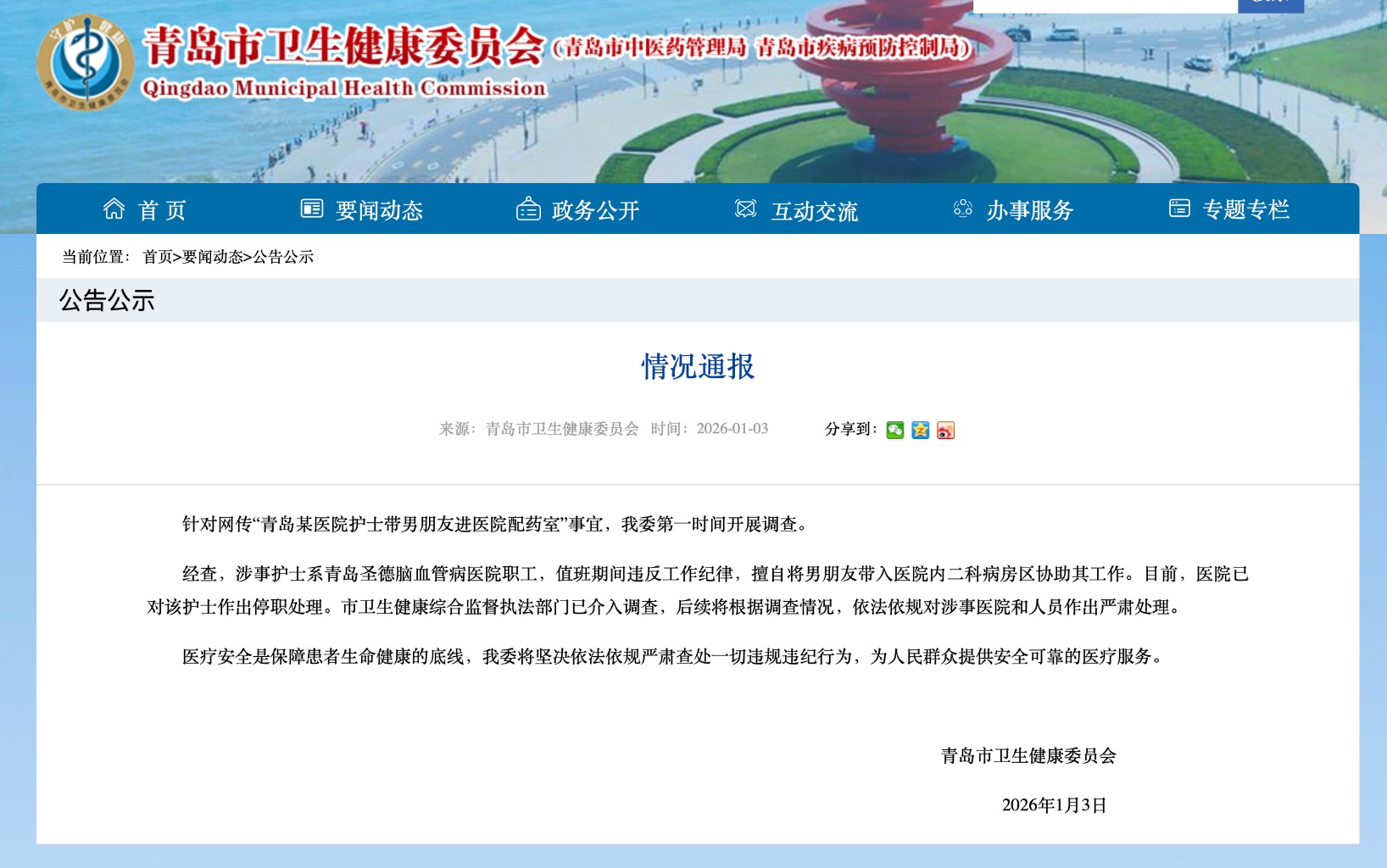 1月3日,青岛市卫生健康委员会发布情况通报: