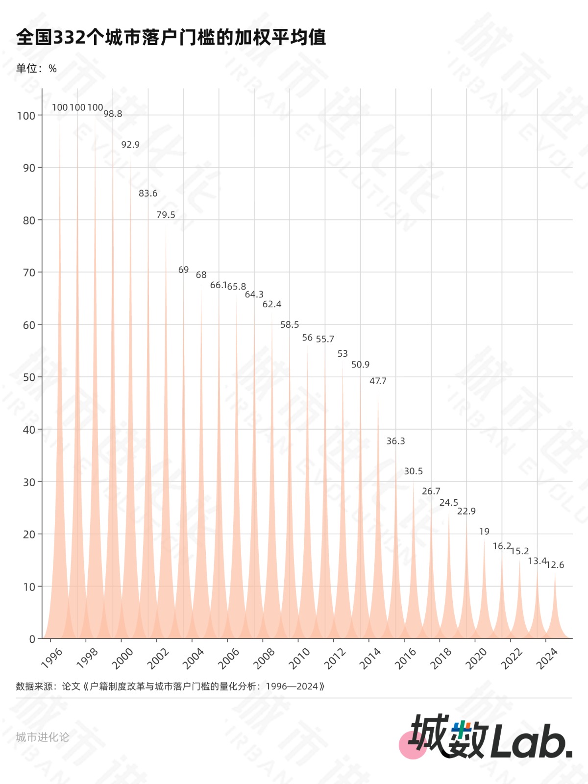 结果显示,全国332个城市的落户门槛加权平均值从1999年98.8%降至2024年12.6%。除一线城市外,其他城市在此期间均经历了较大幅度的快速下降。