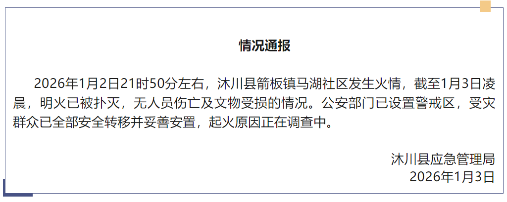 1月3日,四川省乐山市沐川县应急管理局发布情况通报:1月2日21时50分左右,沐川县箭板镇马湖社区发生火情,截至1月3日凌晨,明火已被扑灭,无人员伤亡及文物受损的情况。起火原因正在调查中。