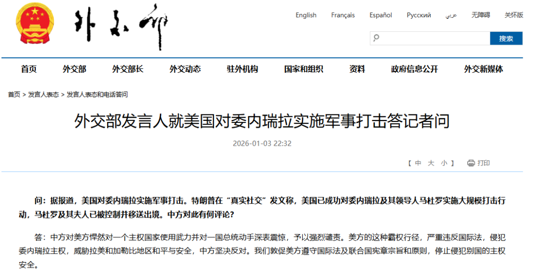 问:据报道,美国对委内瑞拉实施军事打击。特朗普在“真实社交”发文称,美国已成功对委内瑞拉及其领导人马杜罗实施大规模打击行动,马杜罗及其夫人已被控制并移送出境。中方对此有何评论?