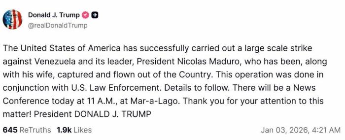 ——2026年1月3日,特朗普通过社交媒体发文说,美国成功对委内瑞拉实施大规模打击,已抓获马杜罗及其夫人并将他们带离委内瑞拉。