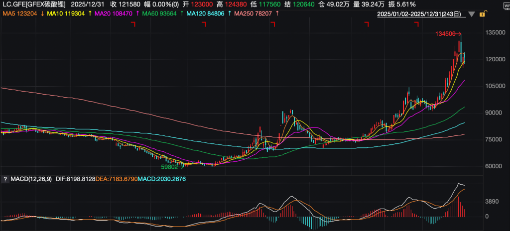 碳酸锂走势呈现“先抑后扬”的宽幅震荡特征,广期所碳酸锂期货主力合约价格2025年年初从7.52万元/吨震荡下行,2025年6月下旬一度跌破6万元/吨关口,下半年受矿端减产扰动及储能需求爆发拉动,价格快速上行,2025年12月29日,价格一度冲高至13.45万元/吨,较年内低点累计涨幅超过120%。