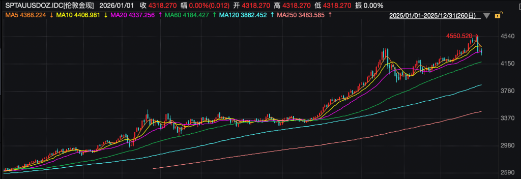 黄金全年涨幅超60%,价格从年初的2650美元/盎司一路飙升至4000美元/盎司上方,年内逾50次突破历史峰值,年末更是一度触及4500美元/盎司的高位。白银涨势更为迅猛,伦敦银现货价格年内累计最大涨幅一度超170%,虽年末出现单日超10%的跳水,但全年仍实现约150%的年度涨幅。铂、钯则后来居上,成为年末市场焦点,现货铂金全年涨约128%,一度刷新历史高位至2478美元/盎司,仅2025年12月单月涨幅就创下39年来最强劲表现;现货钯金全年涨约80%,一度刷新年内高位至1983美元/盎司。