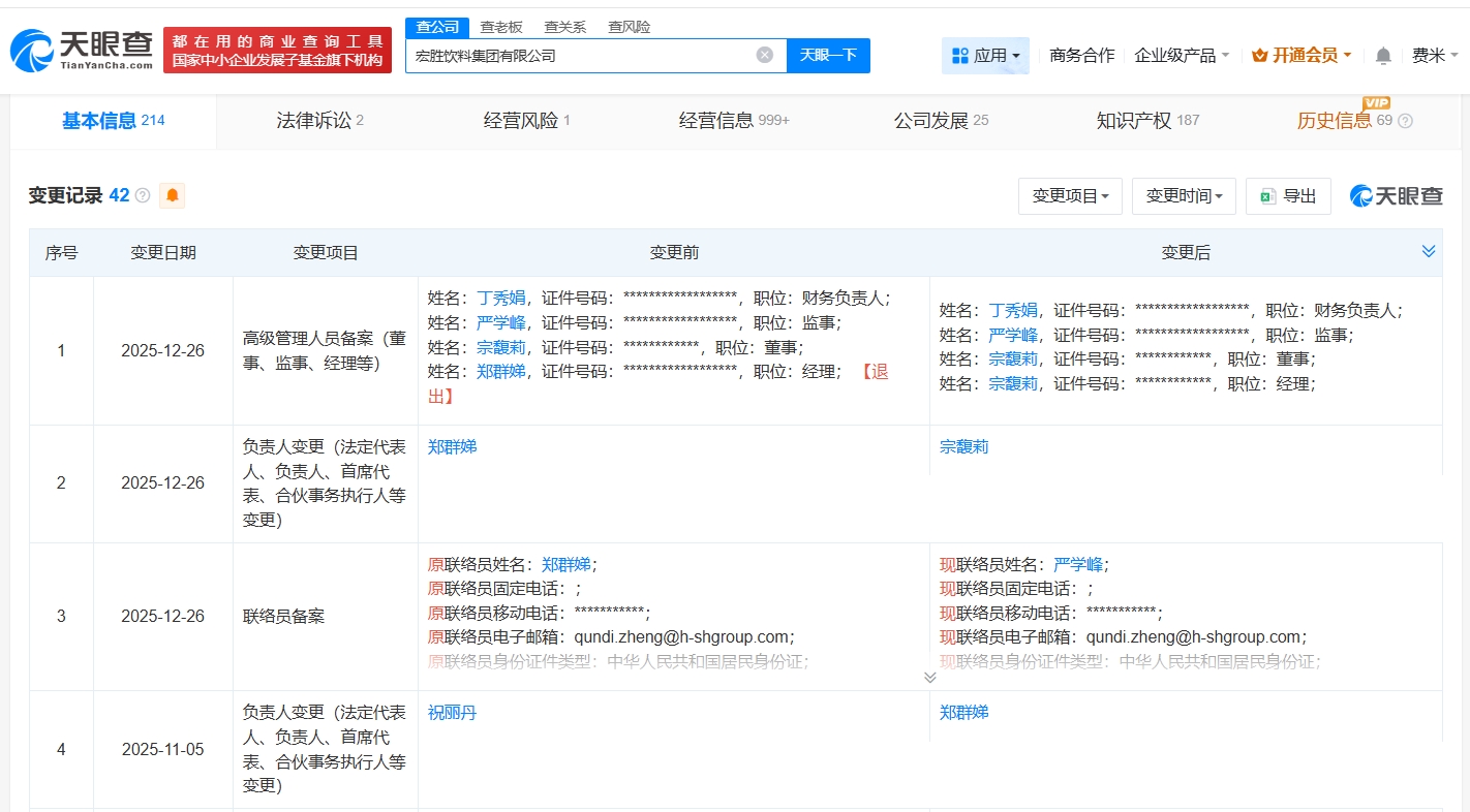 天眼查工商信息显示,近日,宏胜饮料集团有限公司发生工商变更,郑群娣卸任法定代表人、经理、联络员,宗馥莉接任法定代表人、经理,严学峰接任联络员。宏胜饮料集团有限公司成立于2003年10月,注册资本1025万美元,经营范围包括食品销售、食品添加剂销售、塑料制品销售等。股东信息显示,该公司由恒枫贸易有限公司全资持股。值得一提的是,2022年11月,宗馥莉曾卸任法定代表人,由祝丽丹接任。去年11月,祝丽丹卸任该公司法定代表人、经理,由郑群娣接任。