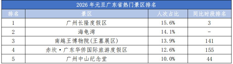 其中,广州长隆度假区以15.6%的人次占比位居首位,较2024年元旦排名上升2位;海龟湾以14.1%占比跃居第二,为新晋热门景区。南越王博物院(王墓展区)和赤坎·广东华侨国际旅游度假区紧随其后,位列第三、第四,较2024年元旦排名大幅跃升,显示出文博类和侨乡文化旅游产品受到游客青睐。