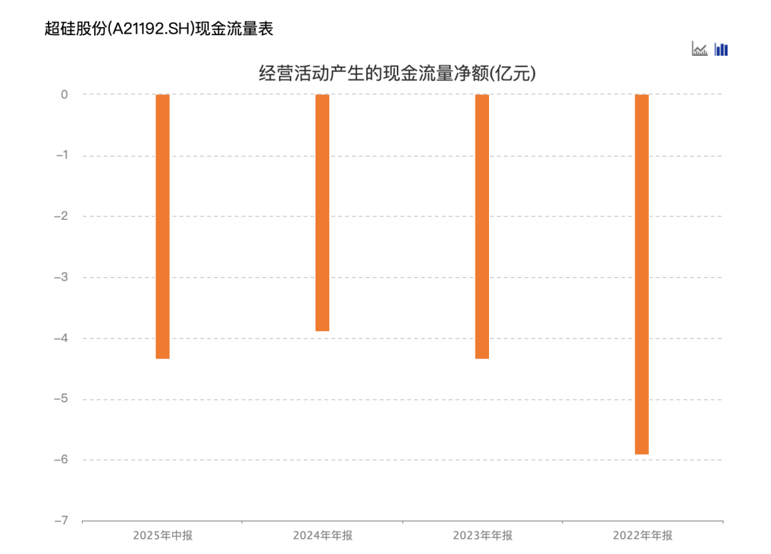 更值得关注的是公司资金链问题,2022-2025年上半年,公司经营活动现金流量净额累计净流出18.5亿元,不得不依赖外部融资“输血”。截至2025年上半年末,超硅股份的短期借款1.1亿元,一年内到期的非流动负债9.85亿元,而同期货币资金仅为6.99亿元,偿债压力明显。另外,同期应付账款6.63亿元是应收账款3.05亿元的两倍以上。