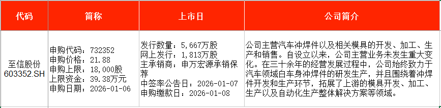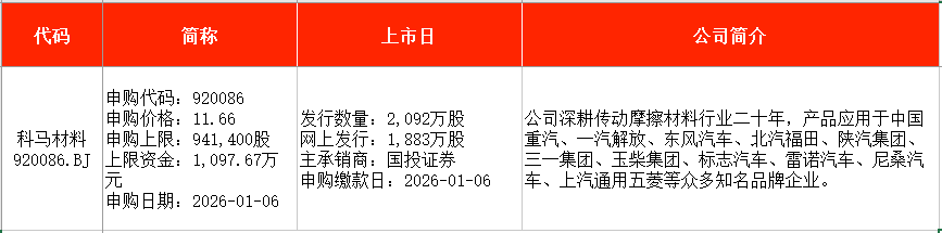 从时间表看,至信股份(603352)、科马材料(920086)均将在本周二(1月6日)申购。