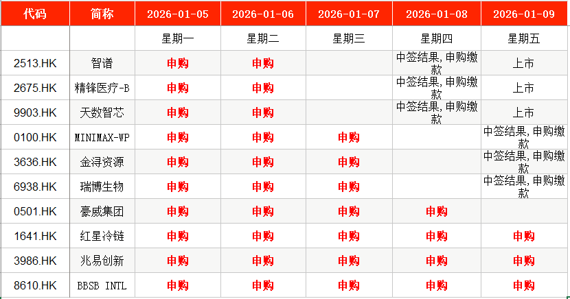 MINIMAX-WP(0100.HK)、金浔资源(03636.HK)、瑞博生物(06938.HK)等,将在周一至周三申购;豪威集团(00501.HK)将于周一至周四申购。