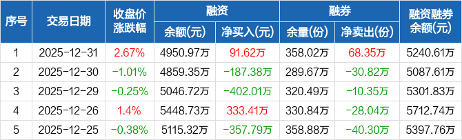 旅游ETF:融资净买入91.62万元,融资余额4950.97万元(12-31)
