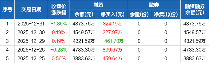成长ETF:融资净买入324.19万元,融资余额4873.76万元(12-31)