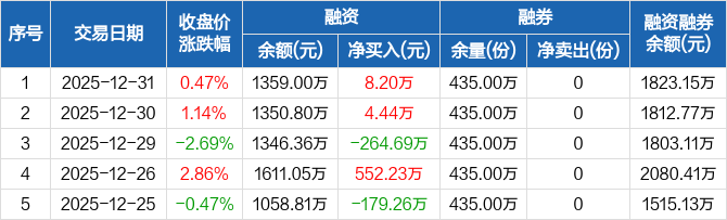 稀有金属ETF:融资净买入8.2万元,融资余额1359万元(12-31)
