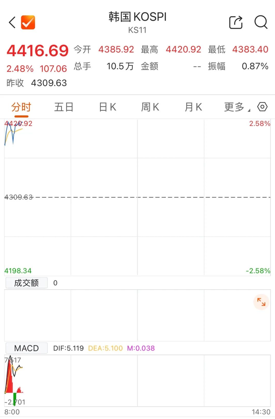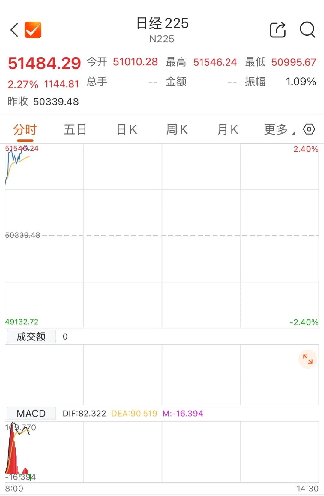 周一早盘,日韩股市高开,日经225指数开盘涨1.33%,韩国KOSPI指数开盘涨1.77%。截至发稿,日经225指数涨2.27%,报51484.29点;韩国KOSPI指数涨2.48%,报4416.69点。