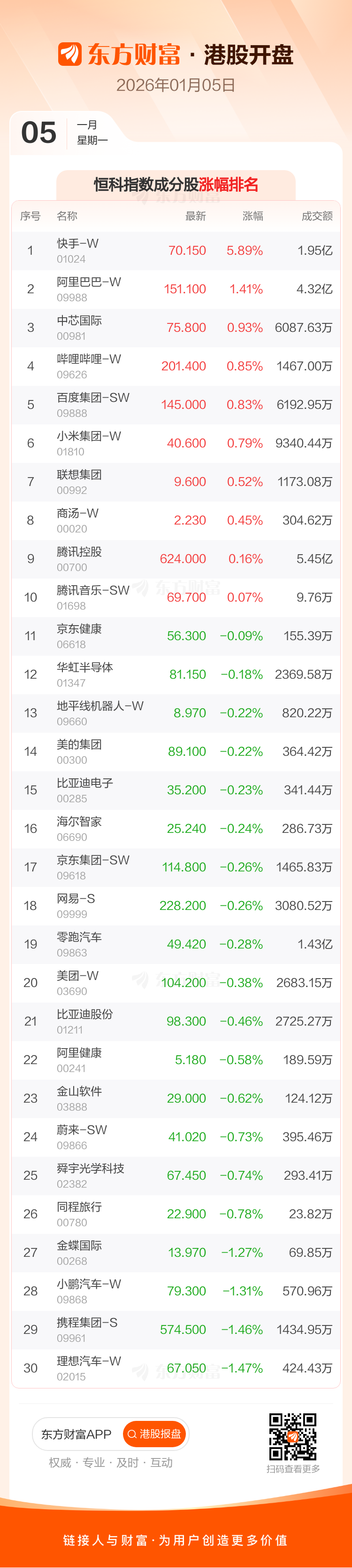 1月5日港股开盘:恒指高开0.09% 快手-W领涨成分股