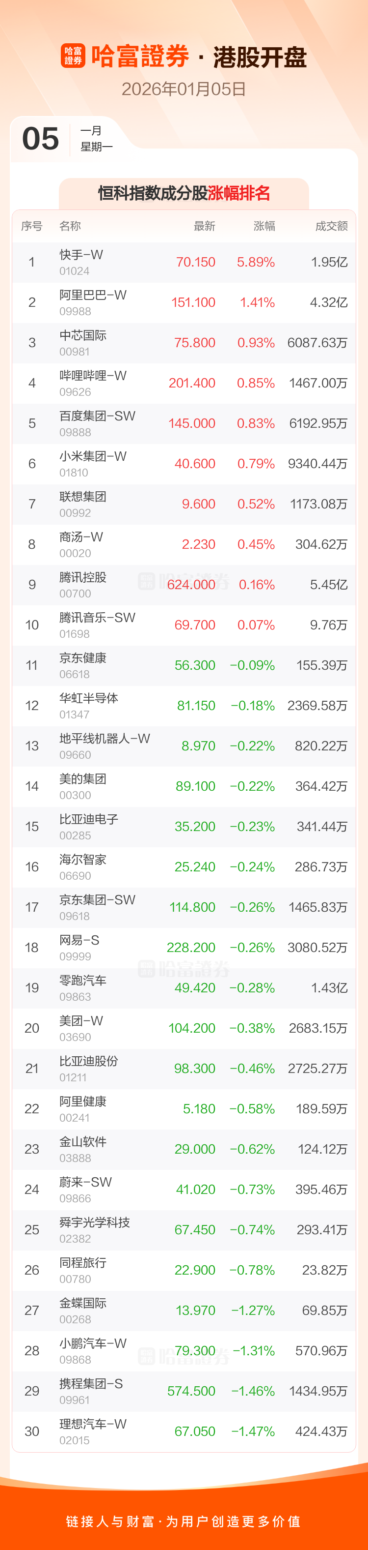 港股1月5日高开,恒生指数开盘报26361.44点,涨22.97点,涨幅0.09%;恒生科技指数开盘报5755.28点,涨18.84点,涨幅0.33%。恒生指数成分股中快手-W、创科实业、中国宏桥涨幅居前,中国海洋石油、信达生物、理想汽车-W跌幅靠前。恒生科技指数成分股中快手-W、阿里巴巴-W、中芯国际涨幅居前,理想汽车-W、携程集团-S、小鹏汽车-W跌幅靠前。