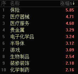 板块方面,保险行业以5.85%的涨幅领涨全市场,新华保险涨超5%,中国太保涨超3%,均创历史新高;医疗、贵金属、半导体、游戏等行业涨幅靠前,均超过3%。