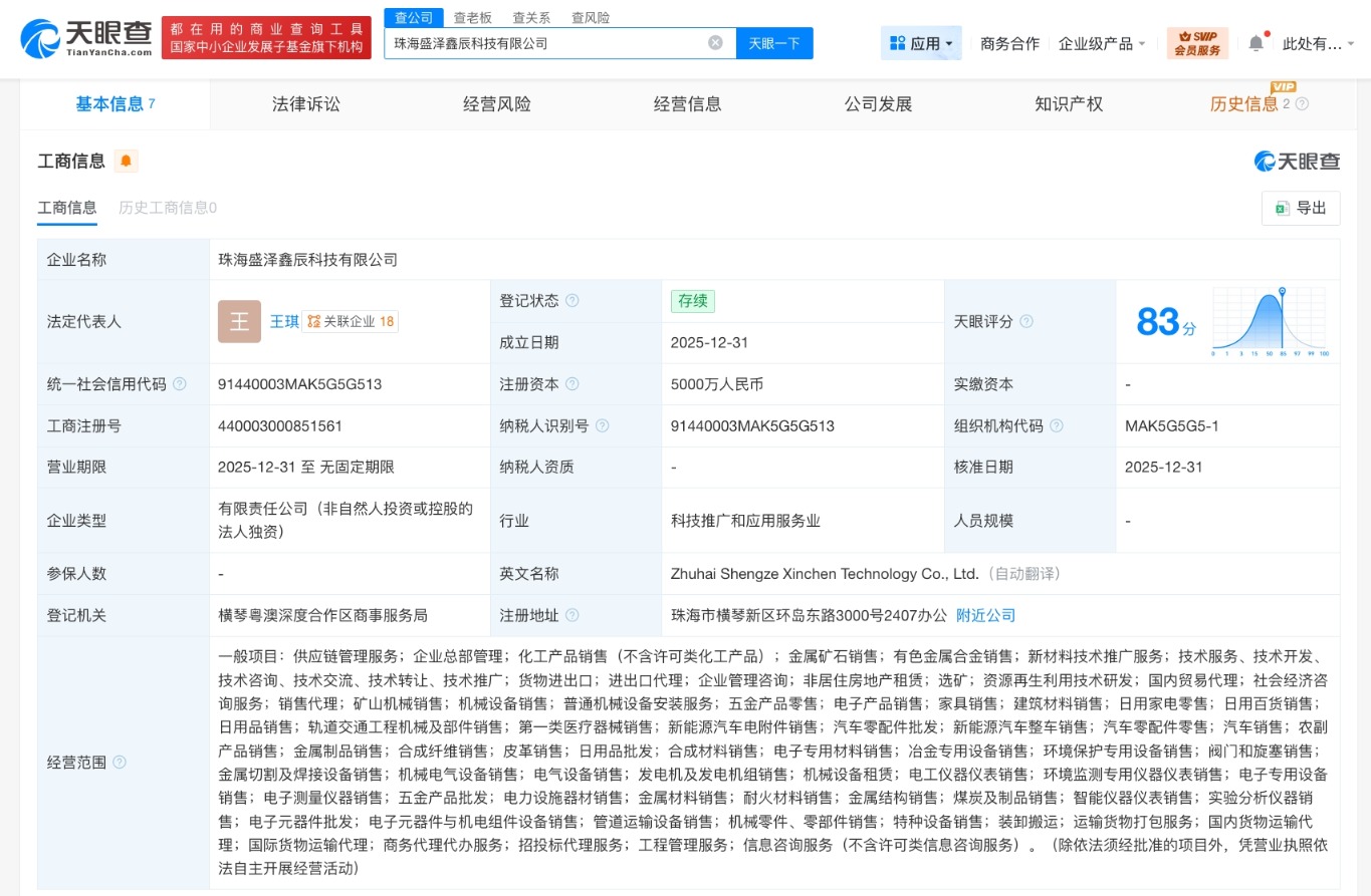 盛新锂能在珠海成立新公司