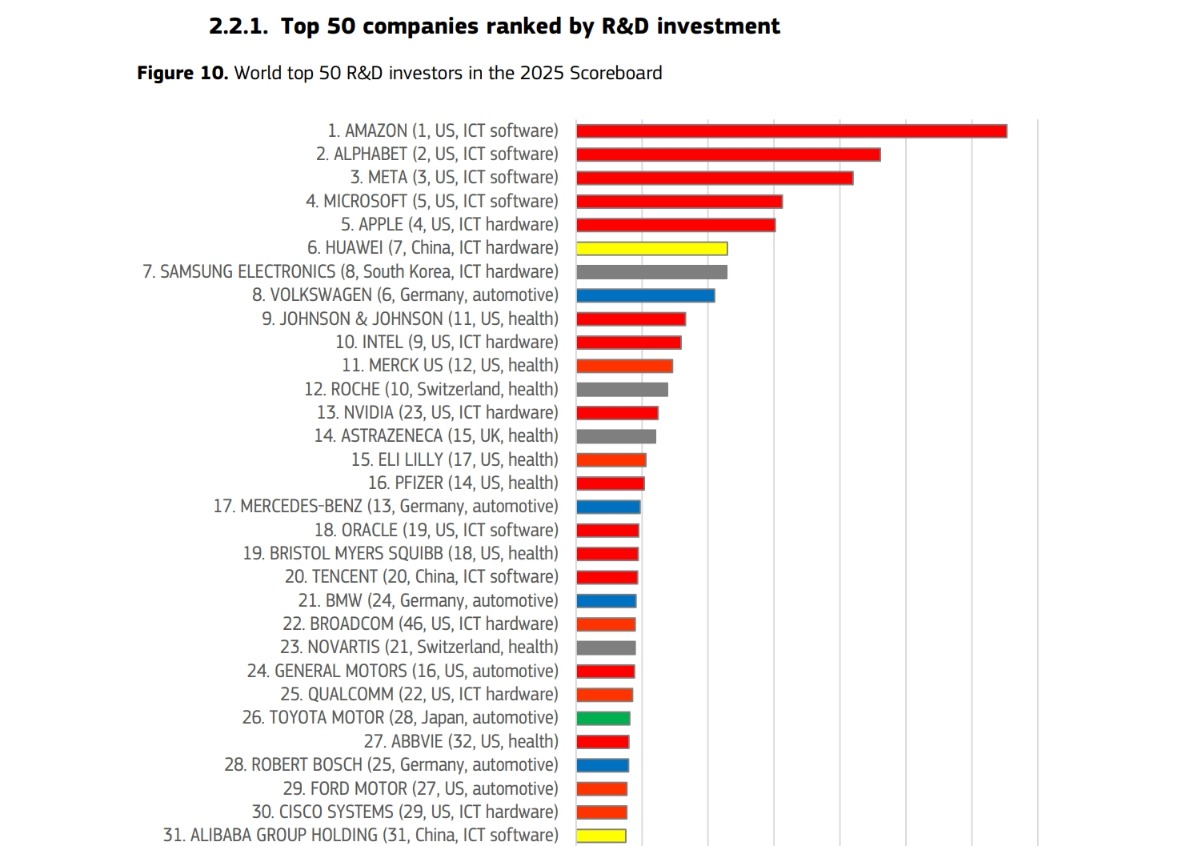 首次列入名单的亚马逊公司位列榜首,2024会计年度共投入653亿欧元研发经费。排名前十的还有谷歌母公司ALPHABET、脸书母公司META、微软、苹果、华为、三星电子、大众汽车、强生和英特尔。