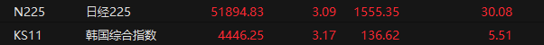 1月5日,日韩股市走强,指数涨幅均超3%。截至北京时间13时20分,日经225指数涨3.09%,报51894.83点;韩国综合指数涨3.17%,报4446.25点。