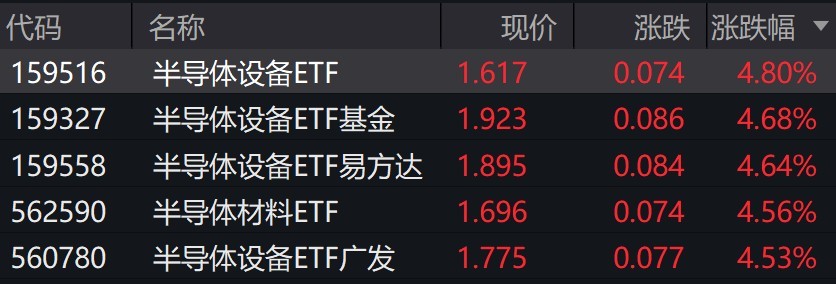 受重仓股上涨影响,半导体设备相关ETF涨超4%。