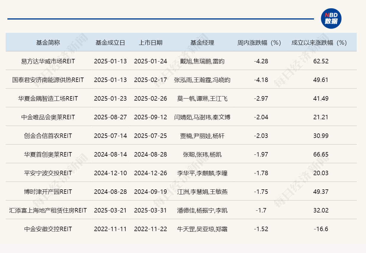 上周跌幅排名前十的公募REITs