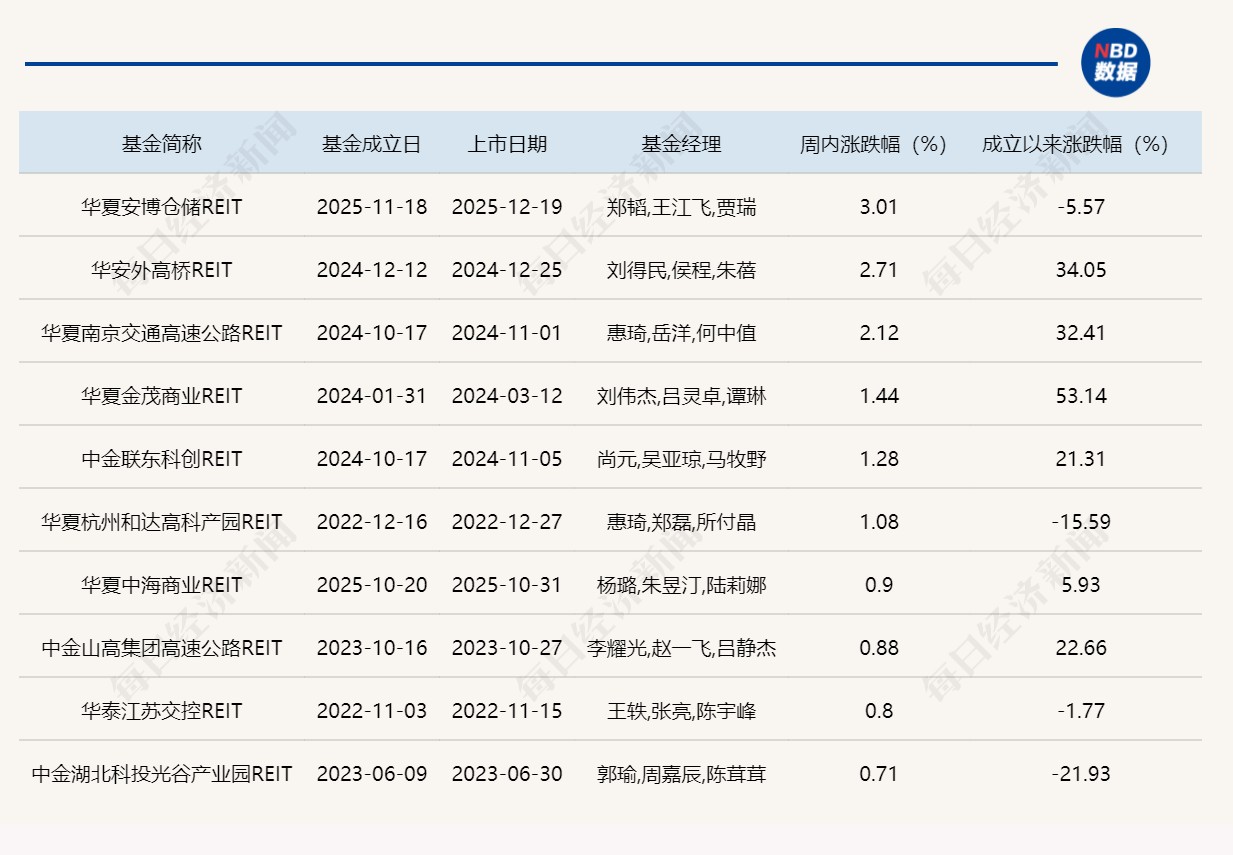 上周涨幅排名前十的公募REITs
