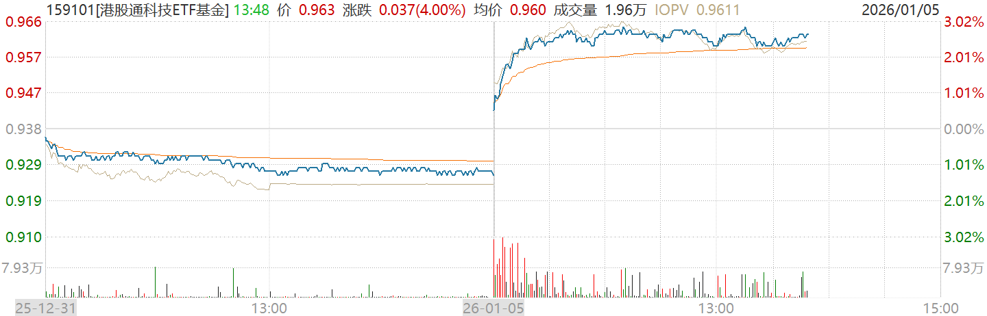 ETF方面,在A股上市的港股通科技ETF基金(159101.SZ)涨超4%。
