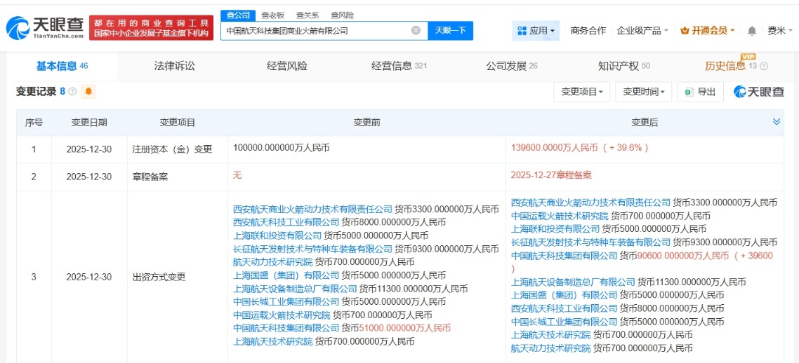 南方财经1月5日电,天眼查工商信息显示,近日,中国航天科技集团商业火箭有限公司发生工商变更,注册资本由10亿人民币增至13.96亿人民币,增幅39.6%。中国航天科技集团商业火箭有限公司成立于2024年9月,法定代表人为候正全,经营范围包括民用航天发射技术服务、火箭控制系统研发、火箭发动机研发与制造、火箭发射设备研发和制造等。股东信息显示,该公司由中国航天科技集团有限公司、上海航天设备制造总厂有限公司、长征航天发射技术与特种车装备有限公司等共同持股。