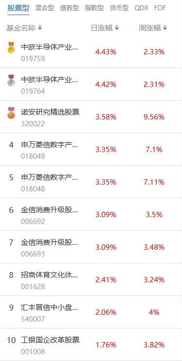 南方财经1月5日电,根据南财基金通数据:2025年12月31日当日收益靠前的股票型基金包括:中欧半导体产业股票型发起式证券投资基金(019759,日收益4.43%);诺安研究精选股票型证券投资基金(320022,日收益3.58%);申万菱信数字产业股票型发起式证券投资基金(018049,日收益3.35%)等。收益较低的股票型基金包括:前海开源价值策略股票型证券投资基金(005328,日收益-2.69%);嘉实信息产业股票型发起式证券投资基金(017489,日收益-2.52%);红土创新新科技股票型发起式证券投资基金(006265,日收益-2.47%)等。