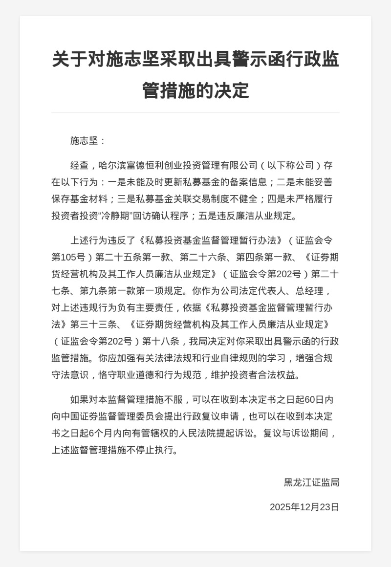 蓝鲸新闻1月5日讯,近日,黑龙江证监局发布行政监管措施决定书,剑指哈尔滨富德恒利创业投资管理有限公司、施志坚。