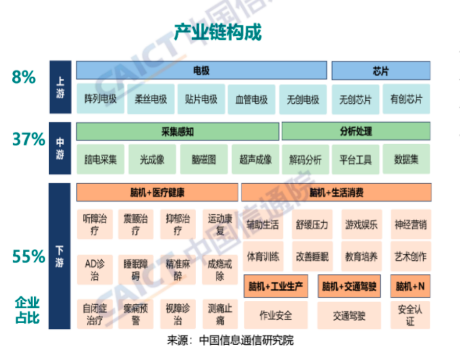 当前,脑机接口行业已经形成了完整的产业链,涵盖上游(材料、芯片、电极等)、中游(信号采集感知处理等)、下游(医疗健康、生活消费、工业生产等)等多个环节。