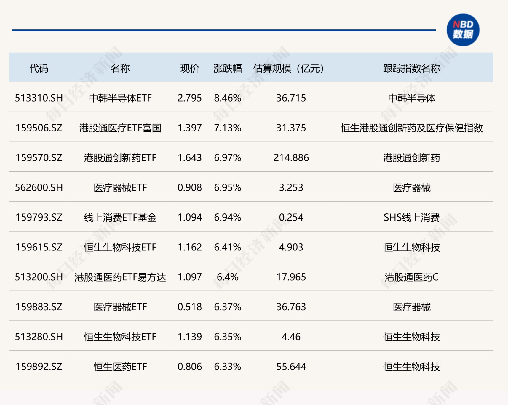 ETF涨跌幅方面,中韩半导体ETF涨超8%,港股通医疗、创新药等ETF涨约7%。