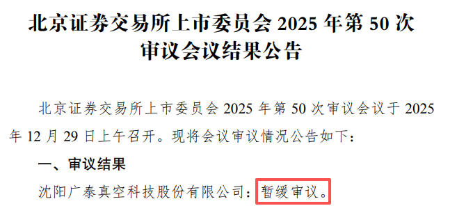 近日,北交所上市委举行2025年第50次审议会议,广泰真空上市申请被暂缓审议,其保荐机构为中信证券股份有限公司。