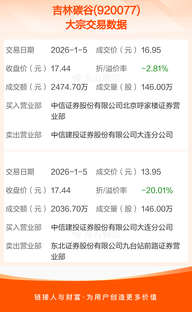 2026年1月5日,吉林碳谷发生2笔大宗交易,共成交292.00万股,成交金额4511.40万元,占其流通市值比例为0.82%。