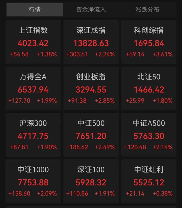 截至收盘,沪指涨1.38%报4023.42点,深成指涨2.24%报13828.63点,创业板指涨2.85%报3294.55点。全市场超4100只个股上涨,市场全天成交额约2.57万亿元,较前一交易日大幅放量。