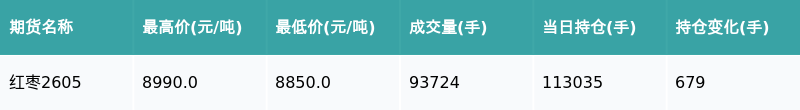 南财智讯1月5日电,南财金融终端盘后期货数据显示,郑州商品交易所的红枣主力合约收跌0.56%,收盘报8955.0元/吨,日内资金流入446.12万元。其他相关指标见下表: