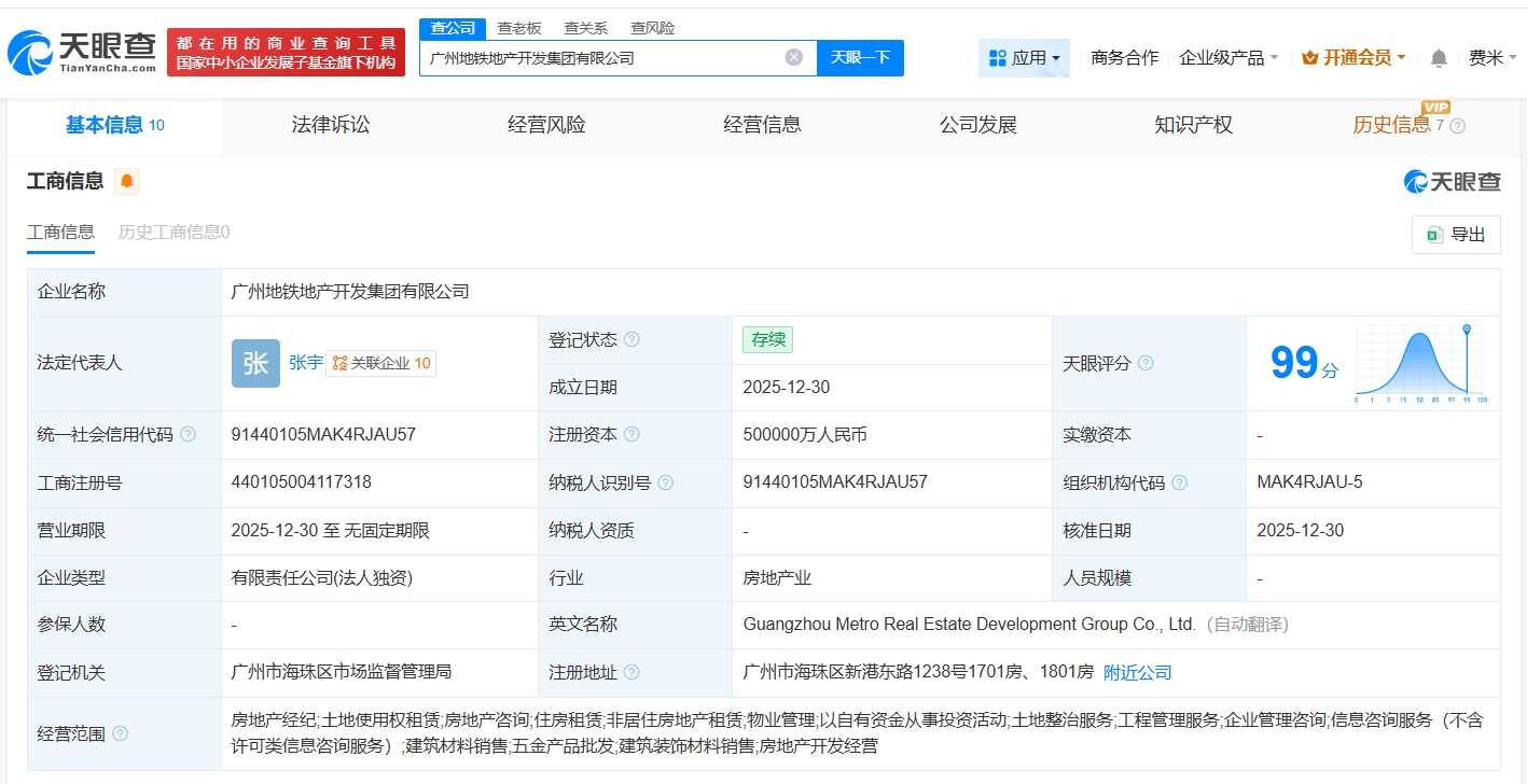 南方财经1月5日电,天眼查工商信息显示,近日,广州地铁地产开发集团有限公司成立,法定代表人为张宇,注册资本50亿人民币,经营范围包括房地产经纪、土地使用权租赁、房地产咨询、住房租赁等。股东信息显示,该公司由广州地铁集团有限公司全资持股。